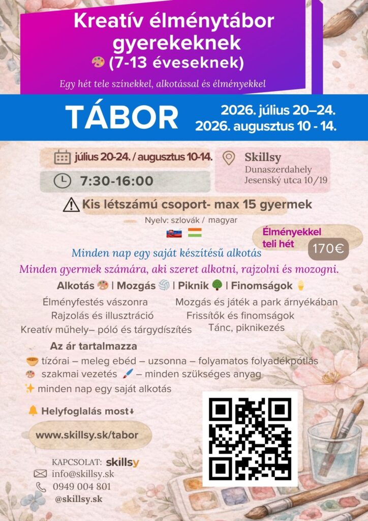 Kreatívny zážitkový tábor na leto pre deti 7–13 rokov Skillsy Dunajská Streda, Jesenského